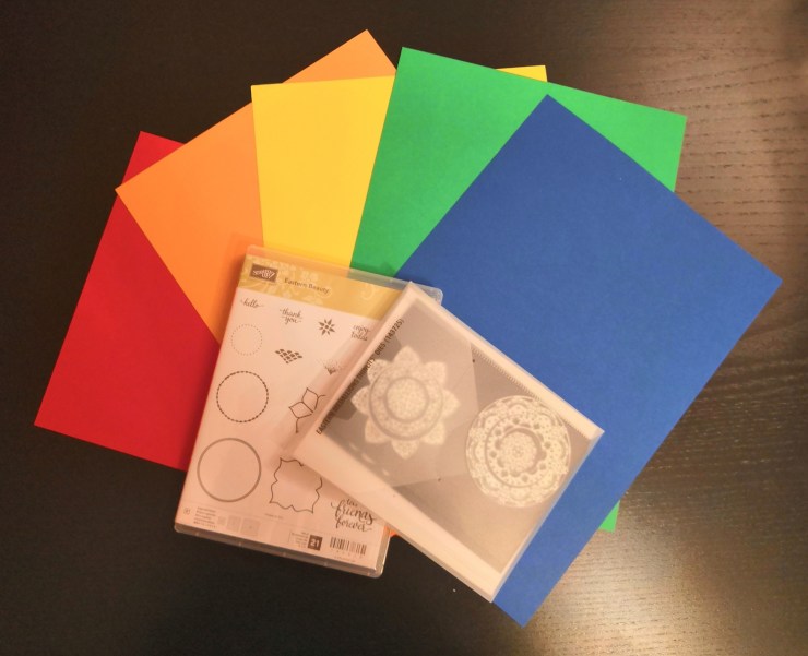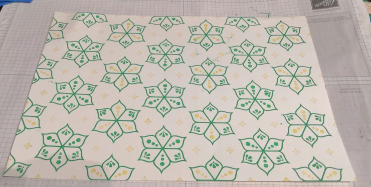 Pour le second, nous avons tout simplement utilisé les encreurs et le set de tampon Beauté de l’Orient (enfin Eastern Beauty dans mon cas, vu qu’on m’avait offert le set en anglais) qui permet énormément de combinaisons pour créer un papier à motif « régulier ».