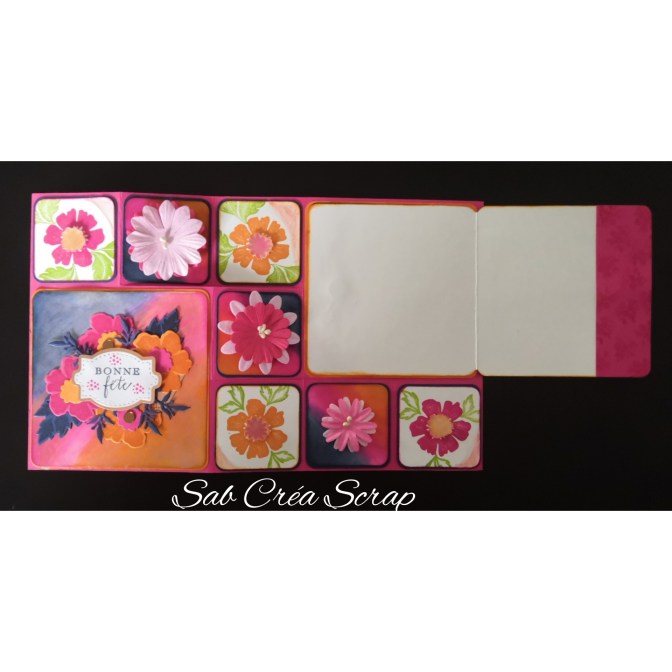 J’ai travaillé certains fonds avec la technique du dégradé à l’éponge, pour retrouver les couleurs de mon coucher de soleil. … et j’ai donné un aspect très fleurie à cette carte.