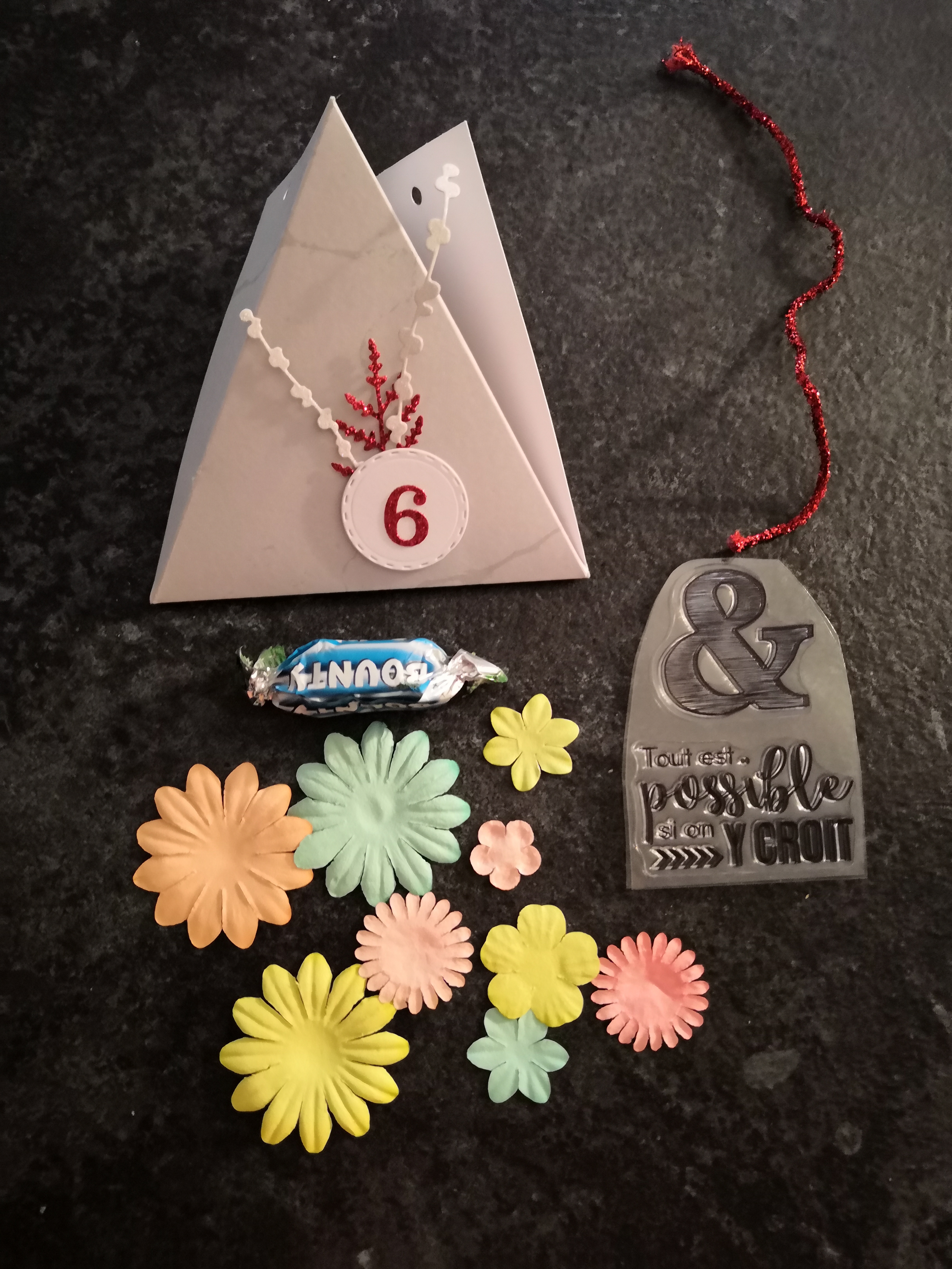 Pour le mois de juin, j’ai découvert dans ma boîte, des fleurs, des tampons et un bounty.