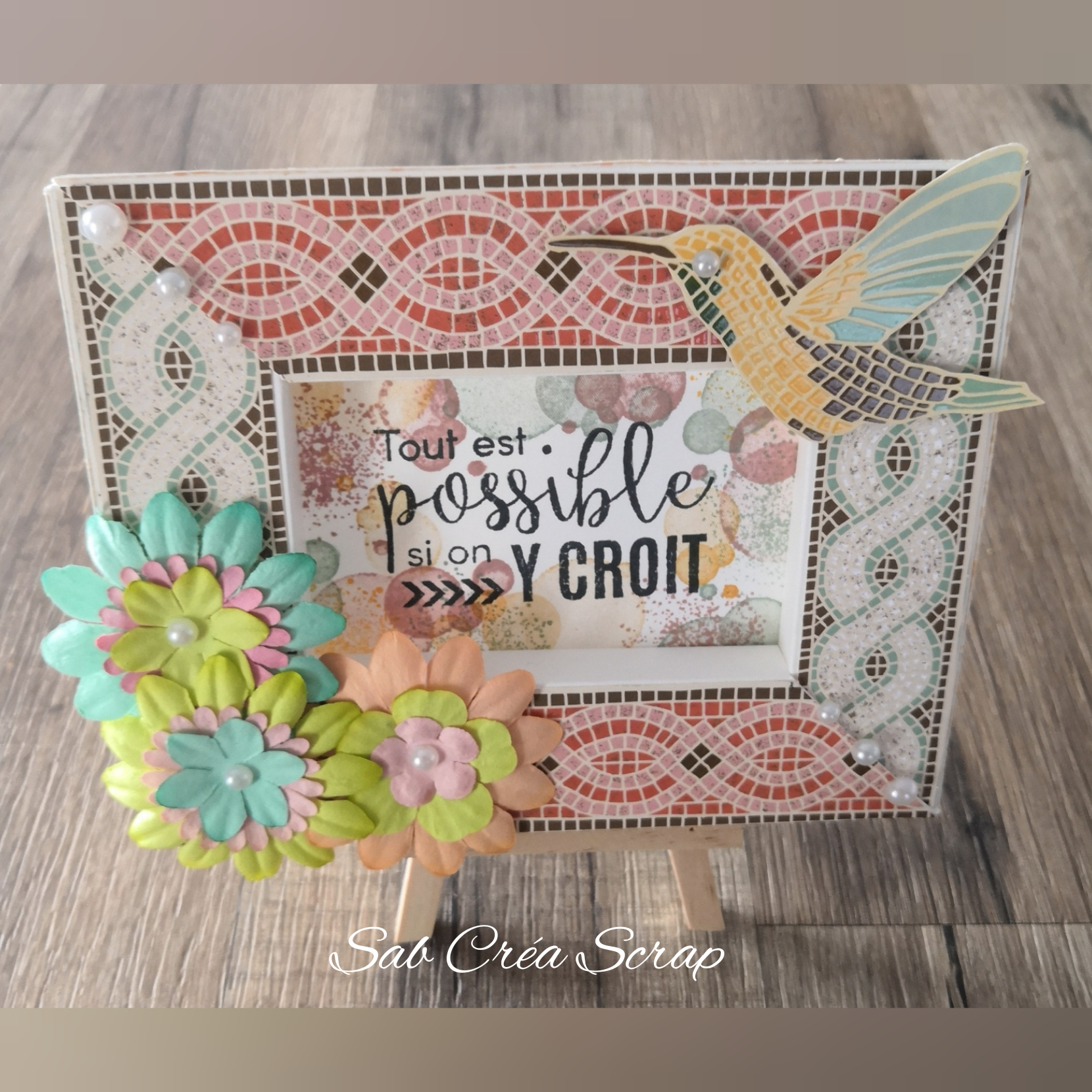 J’ai donc réalisé un cadre en Murmure blanc… Que j’ai habillé avec le papier Esprit Mosaïque.