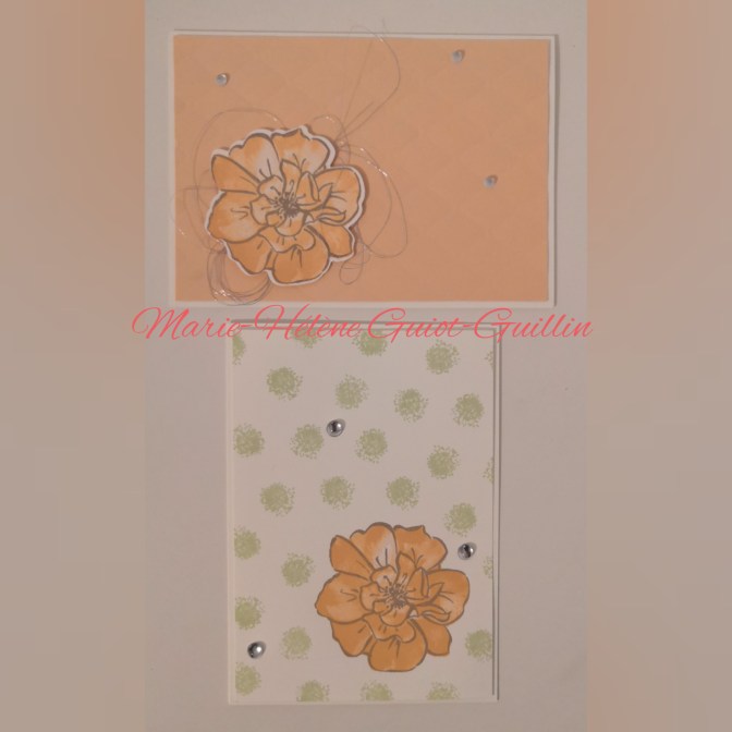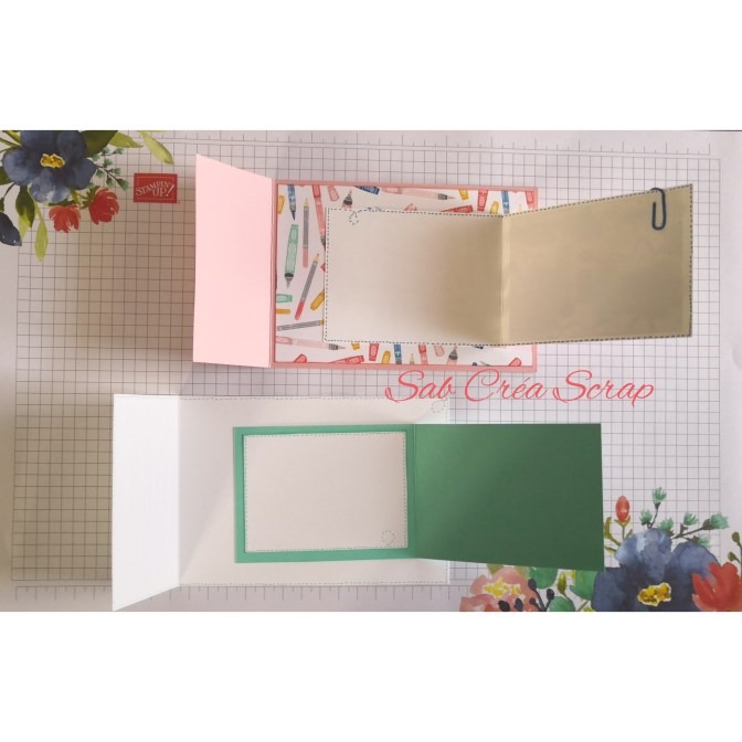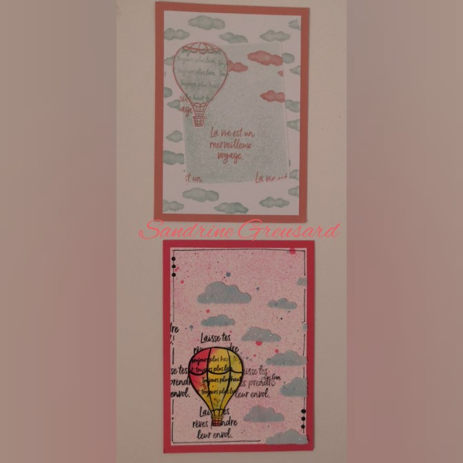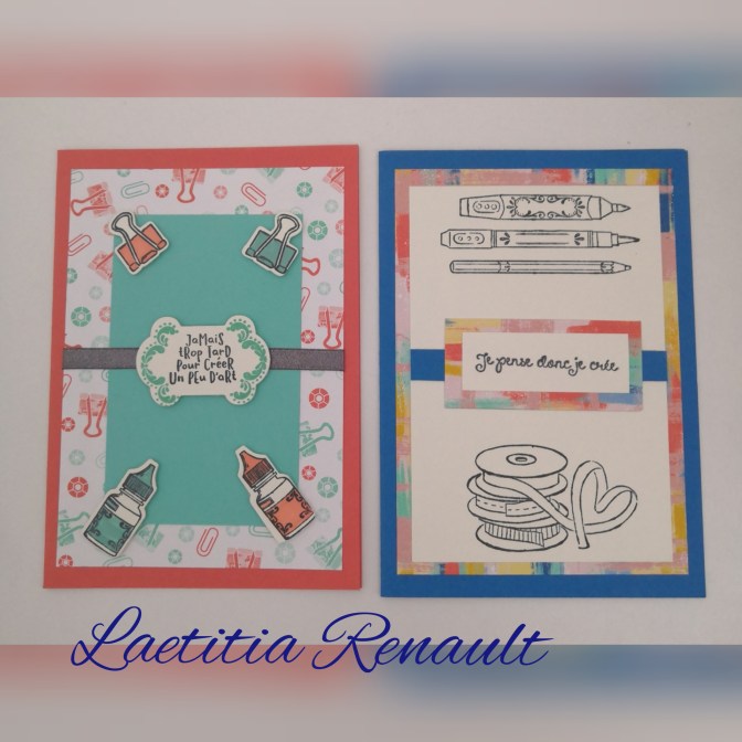 Pour le 1er groupe, j’avais choisi le set de tampon L’art créateur. Pour le côté « technique », j’ai réalisé des cartes « double pliage ».