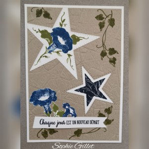 Sophie a choisi de mettre en valeur le set de tampons Etoile du jour qui est coordonné avec les poinçons Etoiles à coudre (découvert avec le CAH 2019), et plioir du lot SAB La force de l’espoir.