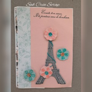 J’ai travaillé avec le DSP spécialité Printemps parisien, le lot Beauté parisienne du CPE, assortie au papier, Murmure Blanc, Pétale Rose, Piscine Party et Ardoise Bourgeoise. Pour les cadeaux SAB, j’ai utilisé le Méli-mélo de ficelle à rôti métallisée et sequins, le set de tampons Fleurs attentionnés et la perforatrice Petite Fleur.