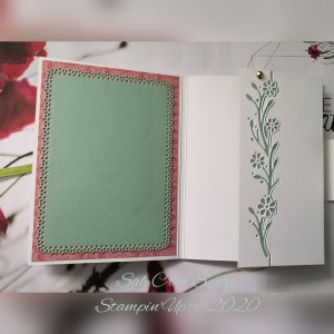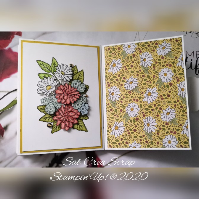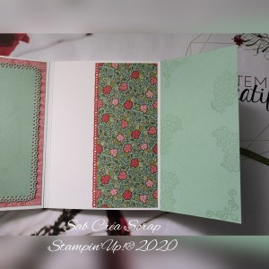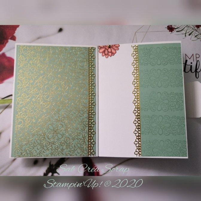 Le kit contenait 1/4 de paquet de DSP Jardin Ornemental (soit 6 feuilles en format 6 »*12 »), du papier unis assorties, 1/4 de papier métallisé Or, 1 m de chaque ruban de la collection et des joyaux dorés.