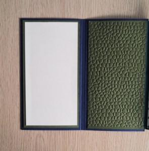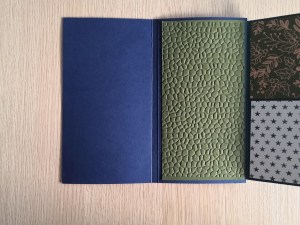- Assembler l’accordéon et la languette et la couverture, en collant la languette au plus près du bord droit de la couverture intérieure.