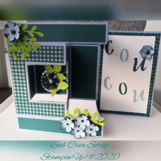 Pour écrire le coucou. j’ai utilisé mes poinçons Prose cursive pour faire un pochoir, qui m’a permis d’encrer mon papier à l’aide de mes doigts éponge. J’ai utilisé les perforatrice Petite fleur et Branchette pour la décoration.