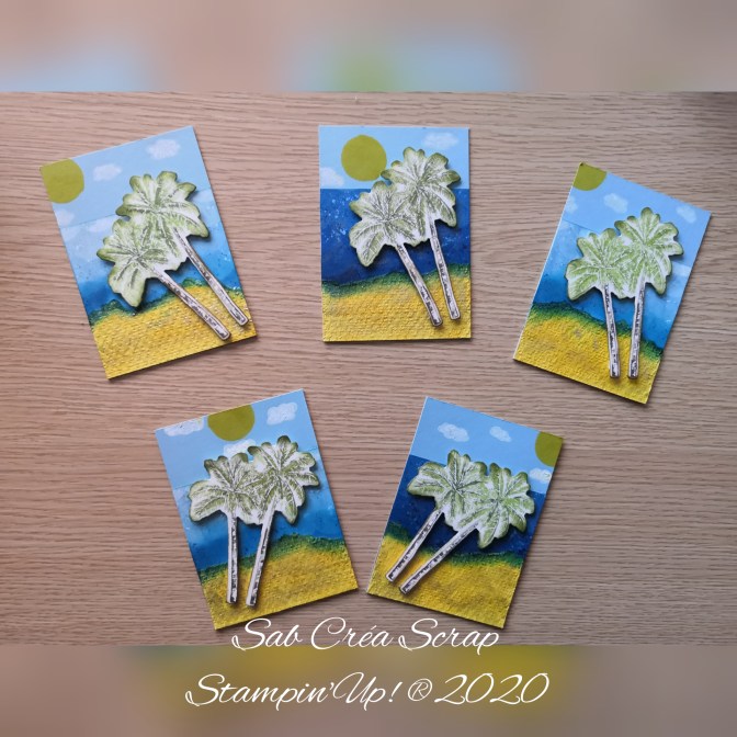 Pour les cocotiers, j’ai utilisé les Stampin’Write pour coloriser le tampon, et obtenir ces différentes nuances sur le tronc et les feuilles, avant de les détourer avec le poinçon coordonné.