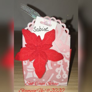 Le marque place est assez simple. Une découpe de boite dans 2 papiers différents, une étiquette, un poinsettia et de l’assemblage.