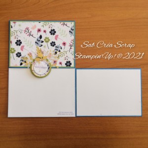 J’ai utilisé le DSP Fleurs en papier, un DSP papier qu’on pouvait gagner pendant la SAB, que j’ai associé au papier Pointe pacifique, Vert olive, Vélin et le papier métallisé Or. Pour le feuillage, j’ai utilisé les perforatrices Branchette, Feuillage et les poinçons Feuillage florissant. Les sentiments sont issus du set de tampons Le troisième âge.
