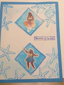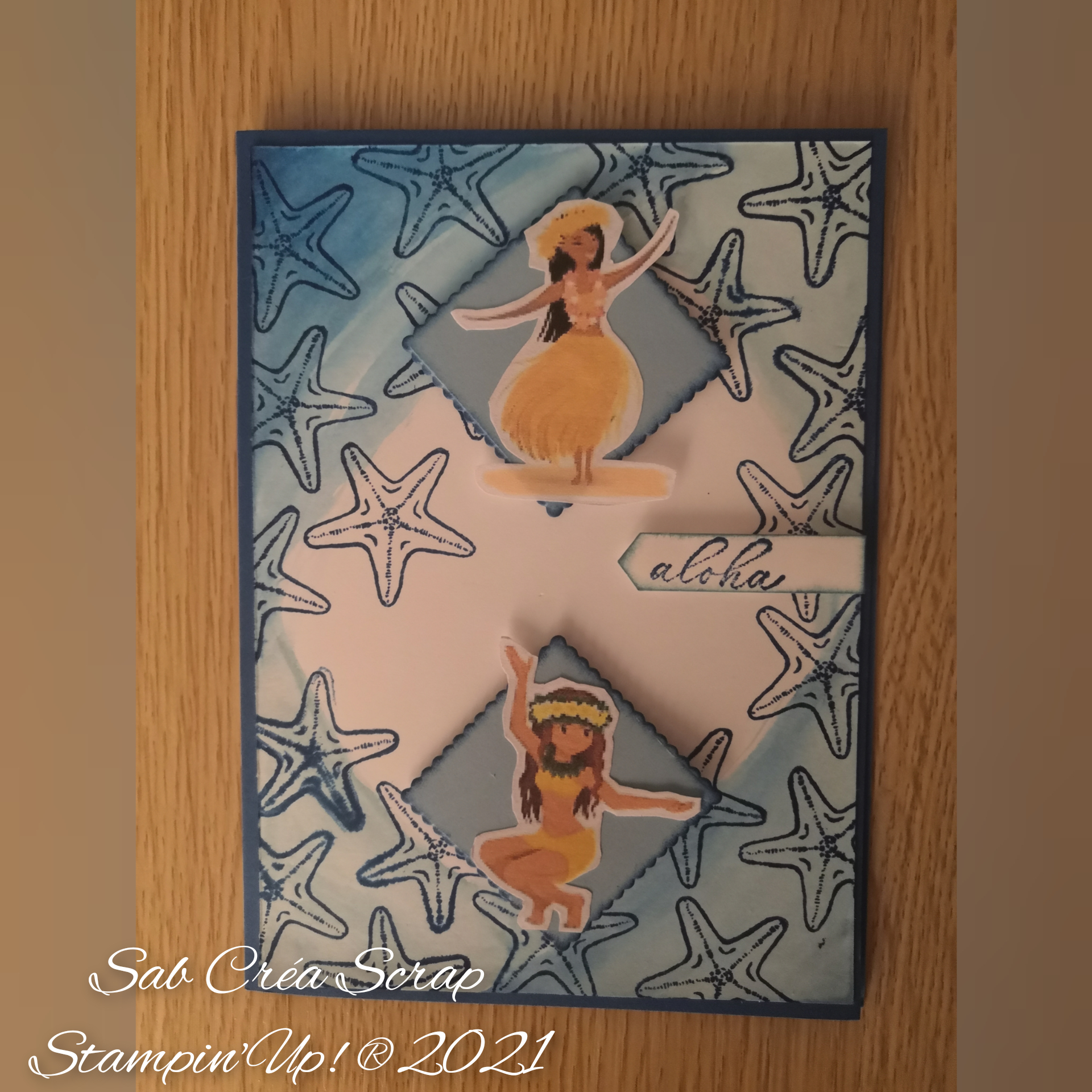 Pour le 1er relai, quand j’ai reçu la carte, j’ai assez vite choisi comme base la couleur Pointe pacifique, que j’ai associé à Béguin bleu, pour une touche plus douce. Les étoiles de mer sont du set Les amis sont comme des coquillages, et le sentiment du set Tropiques éternelles. Je n’avais pas dans mon stock de petites vahinés, j’ai donc cherché sur le net, des images que j’ai imprimées et disposées sur des découpes faites avec des poinçons Pyramide de carrés.