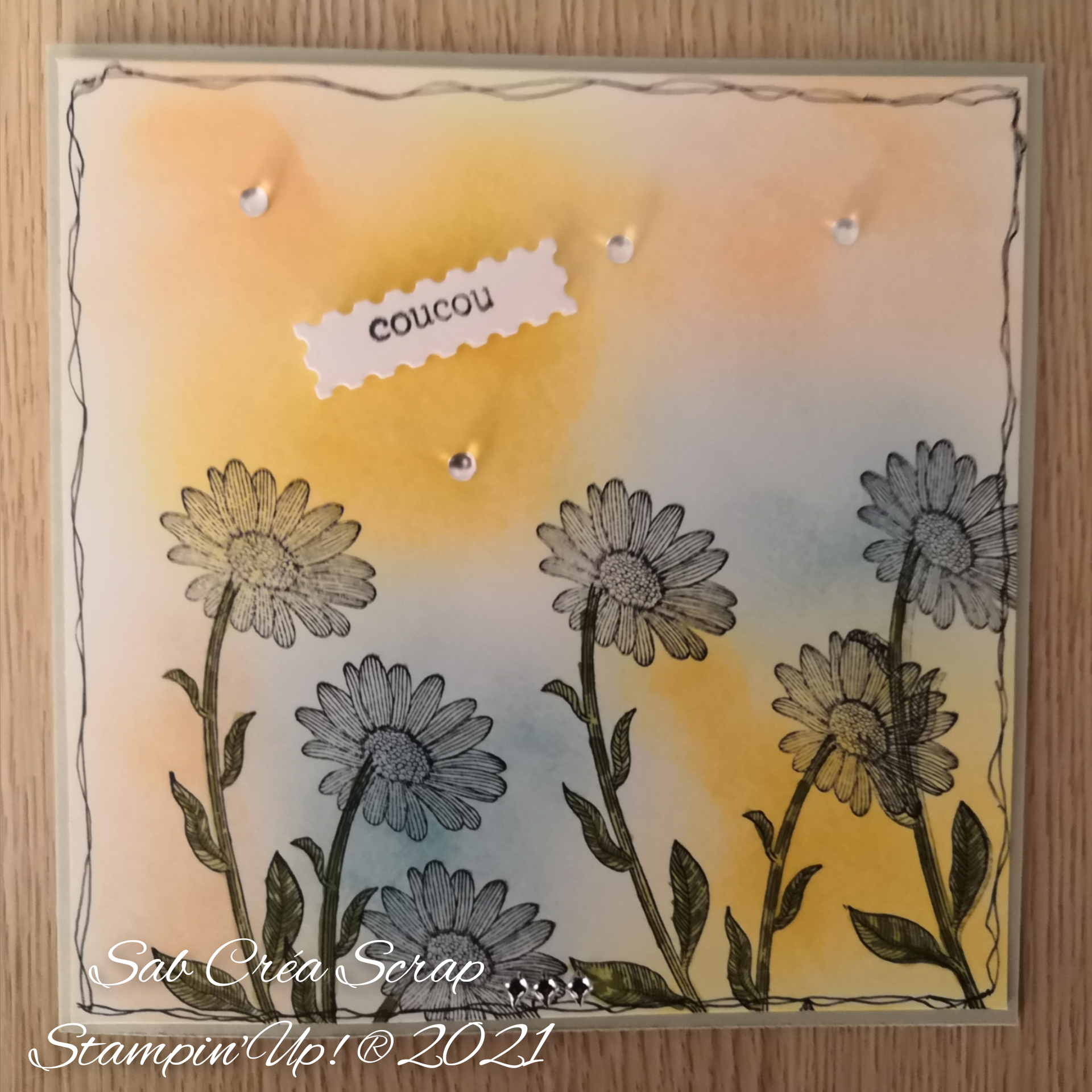 J’ai donc choisi une base de carte Sable de Sahara. J’ai travaillé le fond de ma carte Blanc simple avec des couleurs plutôt tendres comme Pétale rose, Tellement Saffran et Béguin bleu, à l’aide des brosses à estompes. J’ai tamponné les fleurs du set Allée de marguerites avec de l’encre Mémento, pour pouvoir coloriser mes tiges avec le Duo Stampin’Blends Vert Olive. L’étiquette est issu des poinçons Galerie florale et le sentiment du set de tampons Bouquets de feuilles.