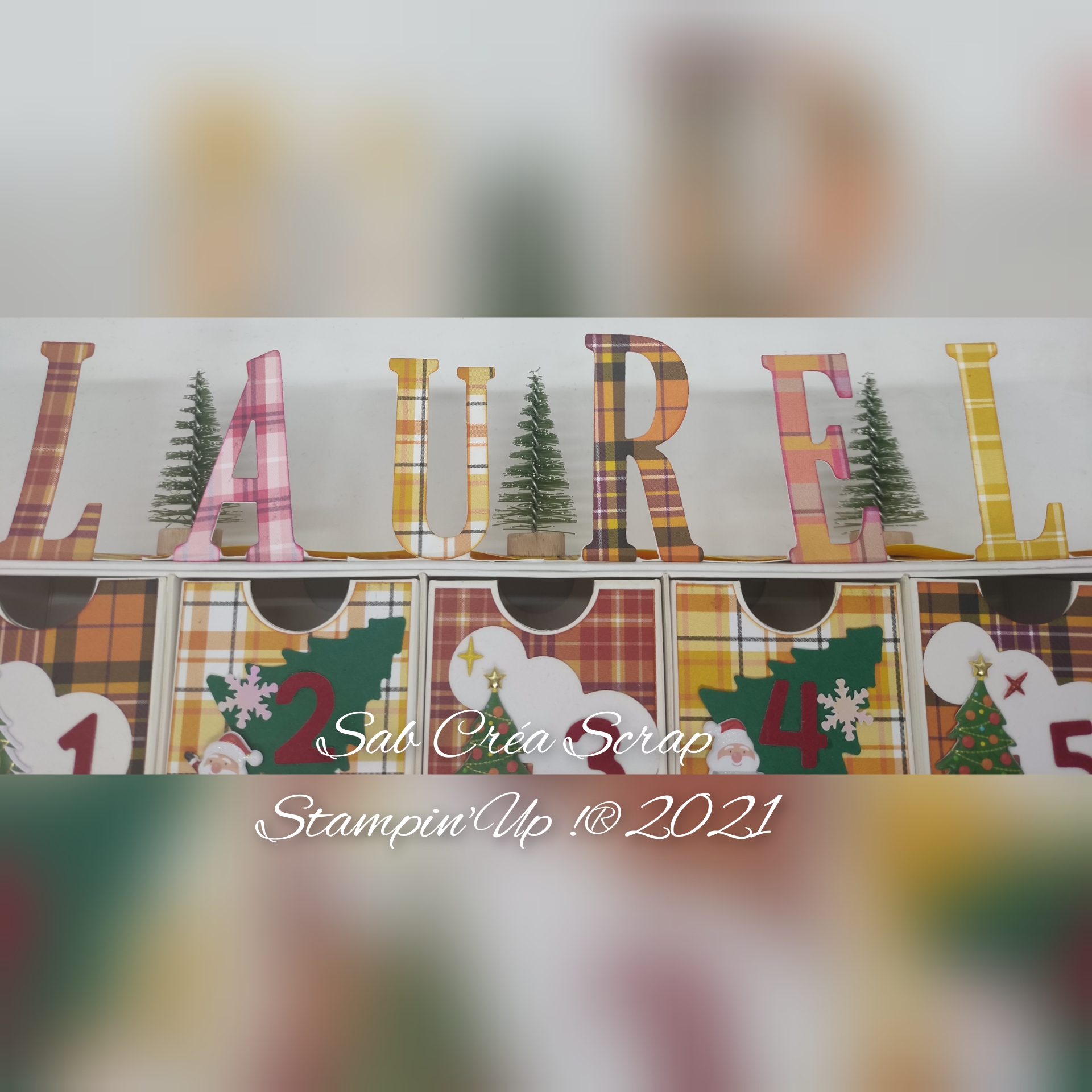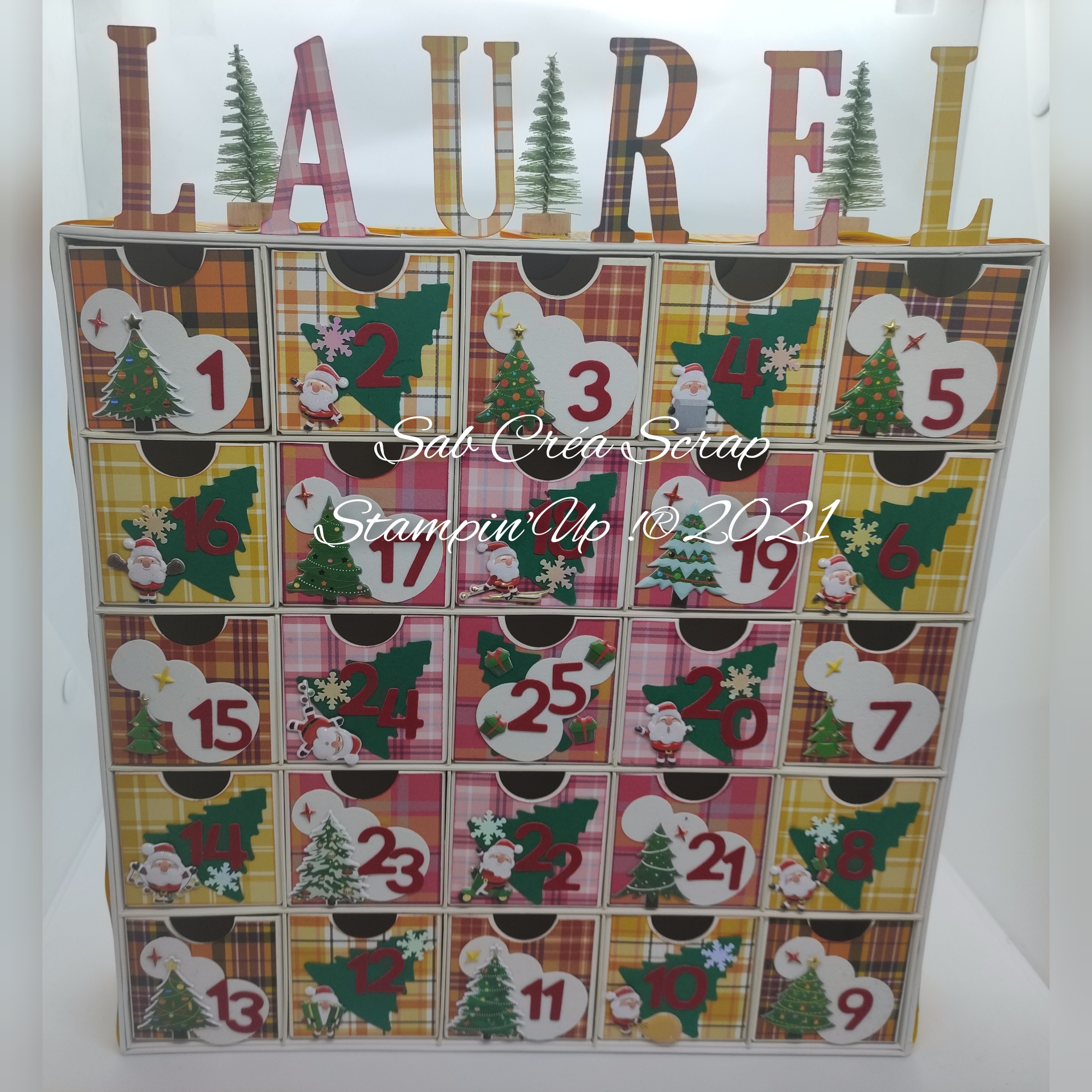 Pour le 2ème, on m’avait demandé un mix de 2 calendriers de l’an dernier. Je devais donc reprendre le côté Bonhomme de neige et sapin du calendrier de Mathias et l’associer au papier style madras (le DSP Joyeux carreaux du MCAD 2020) de celui de ma sœur.