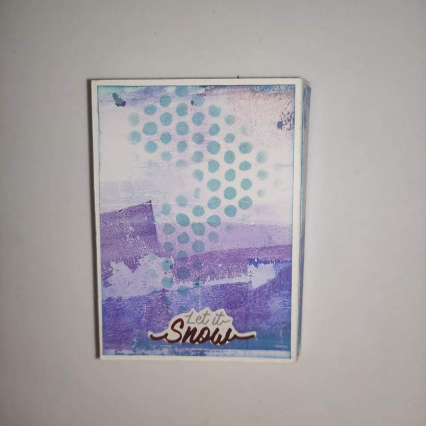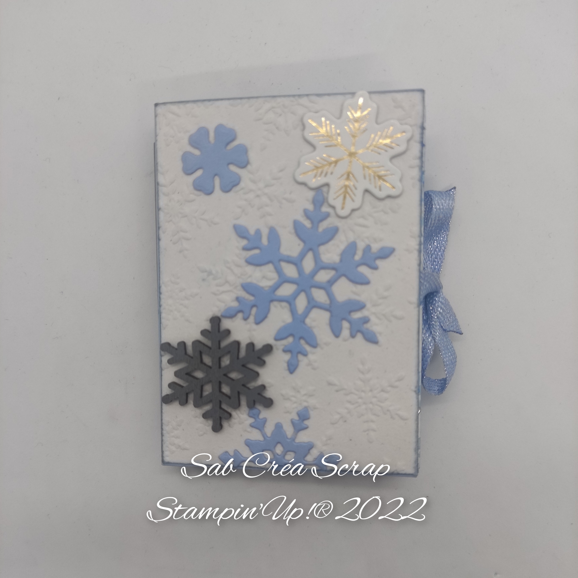 J’ai embossé le papier Velours blanc. J’ai rajouté les découpes de flocons et des embellissements que j’ai reçu lors d’échange.