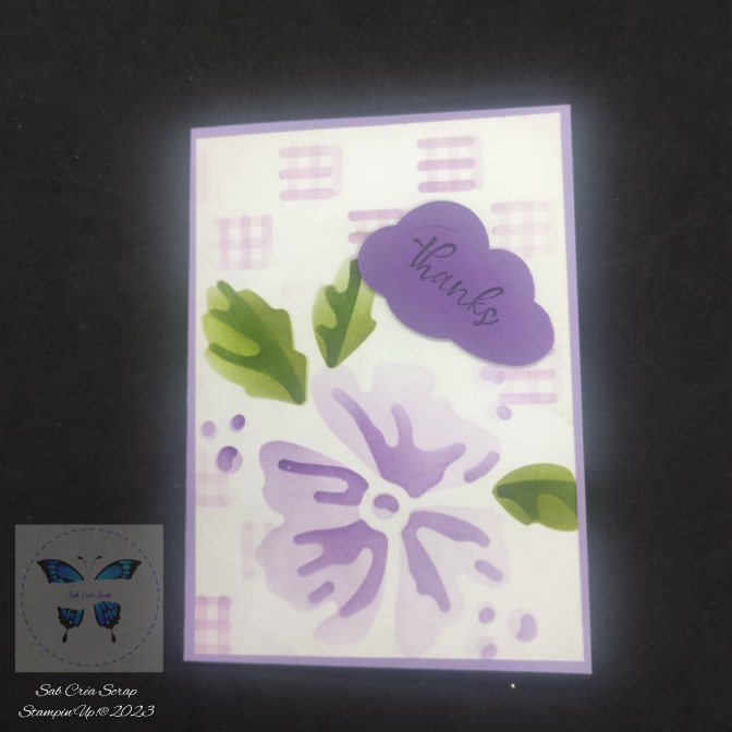 J’ai utilisé les encres Horizon de bruyères et Grappe gourmande pour la fleur, Riche raisin et Vert olive pour les feuilles et Freesia en fleur pour le fond.